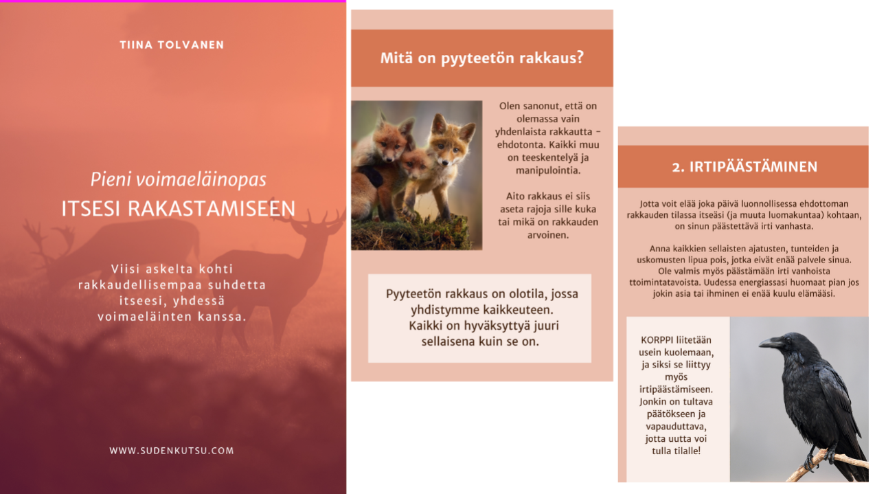 Liittymislahjaksi saat ladattavan e-kirjan "Pieni voimaeläinopas itsesi rakastamiseen". Siinä puhun ehdottomasta rakkaudesta, ja autan sinua yhdessä viiden voimaeläimen kanssa kohti rakkaudellisempaa suhdetta itseesi <3